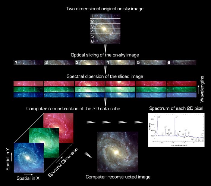 图2. 积分视场光谱的原理。星系2D图像经过视场划分后,为每个视场单元生成光谱。所有产生的光谱都排列成一个数据立方体,其中包含整个二维视场和从光谱仪中提取的第三维,光谱仪将光分成不同的颜色或波长。天文学家可以利用积分视场光谱的丰富信息来测量,例如,遥远星系中气体的运动。Credit: ESO