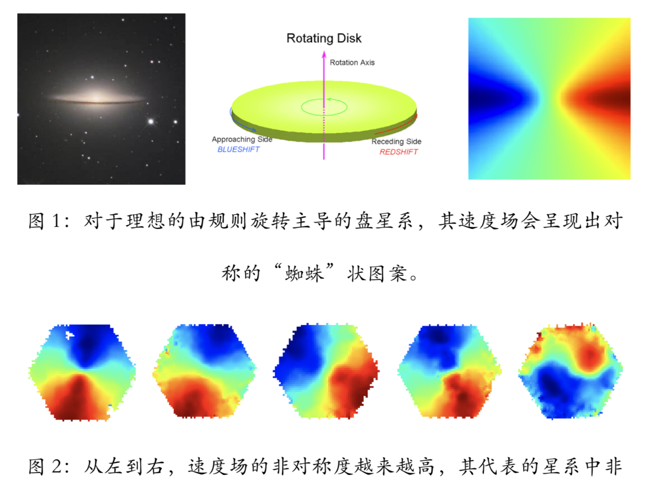 图3. 冯帅等2022年给出理想的由旋转主导的盘星系。紫色箭头表示旋转轴,两侧分别是蓝移与红移成分。