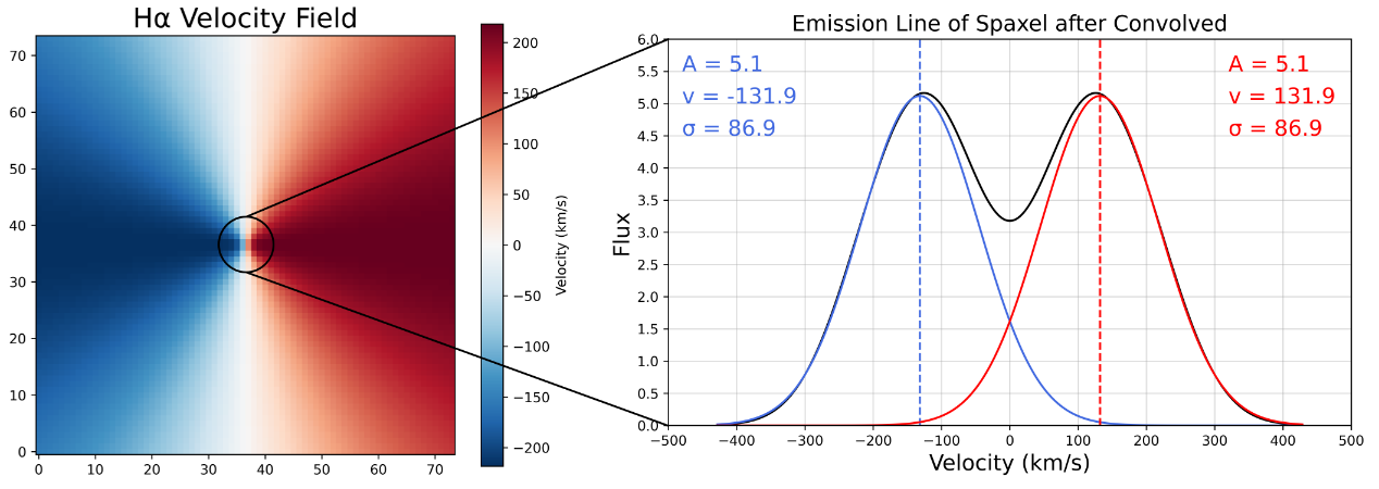 在一个空间分辨率无限高的理想望远镜下,旋转盘星系上每一个点的气体运动都可以被分辨出来。那么,观测到的光谱将是:在盘的蓝移一侧看到一个蓝移的发射线峰,在红移一侧看到一个红移的发射线峰。在任何一个具体的位置上,气体都只有一个主导的速度方向,因此只贡献给一个峰(如图3所示)。然而,现实中的所有望远镜都存在空间分辨率极限。这意味着,我们无法分辨出盘上微小的细节(PSF效应)。来自盘上一大片区域的光,都会被望远镜混合在一起,汇集到同一个像素或光谱元中。这个被混合的区域,其尺度远大于盘上具有单一速度的局部区域。在一个被PSF模糊掉的区域内,如果同时包含足够多的、具有显著速度差异(即高速蓝移和高速红移)的气体,那么这个区域将产生明亮的双峰窄发射线。