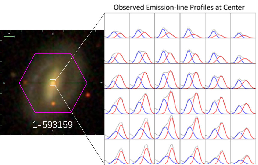 然而,在经过数十年的深入研究后,天文学家发现,星系中心的双峰窄发射线现象是普遍存在的,并且其产生机制远不止相互绕转的双AGN这一种;高速旋转的气体盘与AGN导致的气体外流都可能产生双峰窄发射线。近年来,随着新的天文仪器与技术的发展,以积分视场光谱仪为依托的积分视场光谱(IFS)技术对研究双峰窄发射线发挥了非常重要的作用。由于IFS同时提供了星系空间分辨的能谱信息,天文学家可以通过对比不同空间中发射线特征的变化来探究星系中双峰窄发射线的起源。