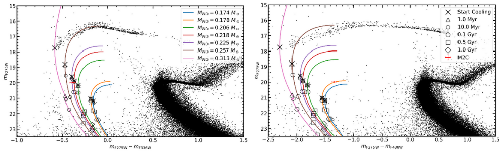研究团队首次建立了M2星团中脉冲星的“相干相位”(phase-coherent)计时模型,并通过贝叶斯计时分析,以高精度测量出了M2中脉冲星双星系统的开普勒轨道参数。在M2A与M2E脉冲星双星系统中,测量出了广义相对论框架下的轨道近日点进动,并由此计算出了双星系统的总质量,分别为1.75与1.80个太阳质量。通过哈勃望远镜数据库,研究团队搜寻到了M2C脉冲星伴星的光学对应体,并确认其为一颗白矮星。通过结合光学与射电观测结果,重构出了该系统的双星演化路径,并以此定出了伴星的冷却年龄(cooling age),约为1千万年。这使得M2C的白矮星伴星成为已知的球状星团脉冲星双星系统中最年轻的白矮星。