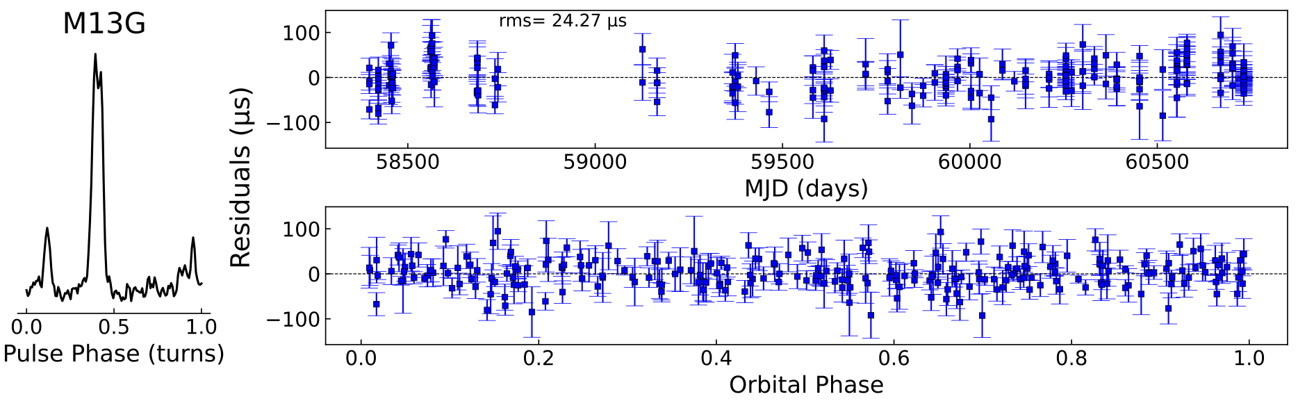 研究团队成功得到了M13G的“相干相位”计时模型,确认了该系统为典型黑寡妇系统(自转周期4.32ms,轨道周期0.12天,伴星质量<0.01太阳质量,见图3),该系统是M13中距离星团中心投影角距离最大的脉冲星,距离星团中心1.8角分,且该系统处于圆形轨道中,这一观测事实,为“脉冲星轨道偏心率会随着与星团中心距离的增加而减小”的动力学理论提供了有力的观测支持。